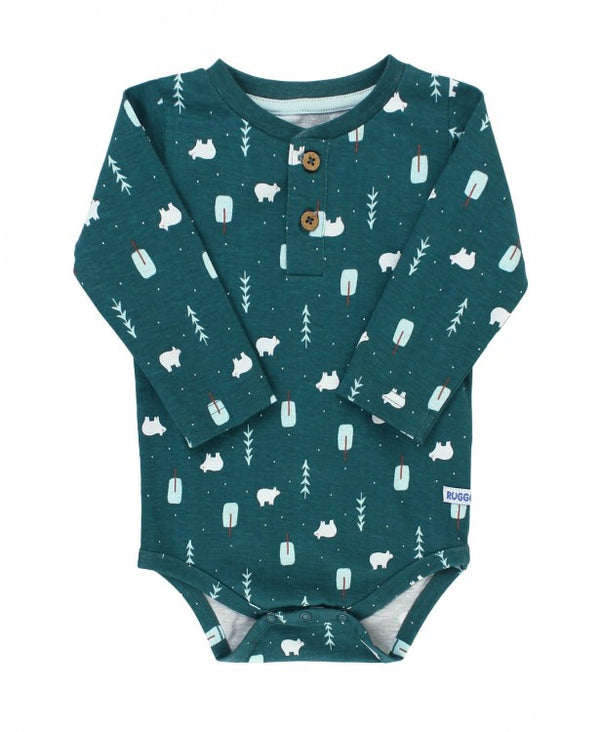 This 100% cotton knit bodysuit is a wardrobe must-have. Perfect on its own or for layering, this all-in-one is as stylish as it is comfy. It features an adorable polar bear and pine tree print for winter wonderland days.